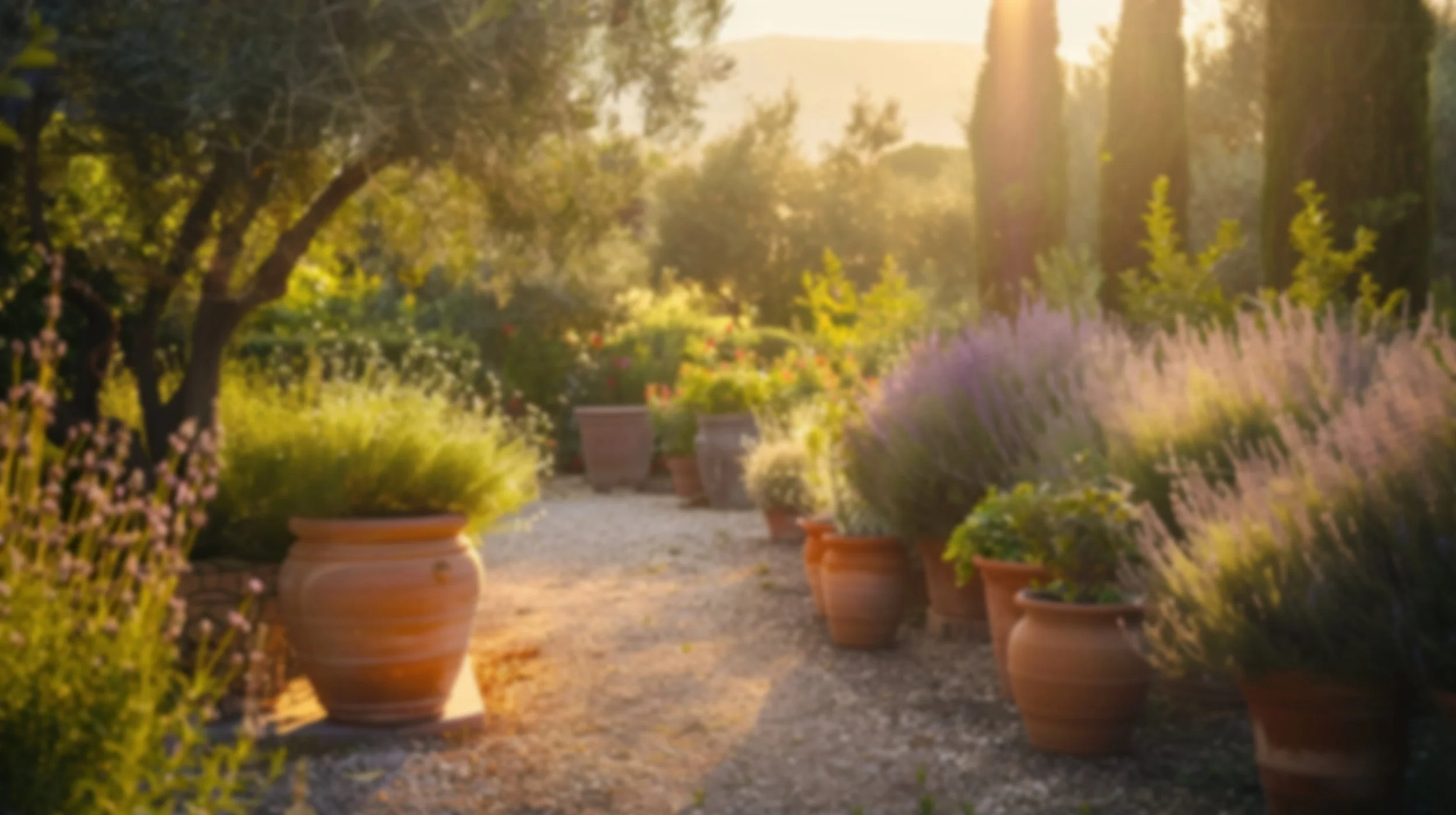 Ein mediterraner Sommerort mit Kräutern, Weinreben und mobilen Zitruspflanzen. Geeignet für sonnige, warme Gärten und Terrassen.